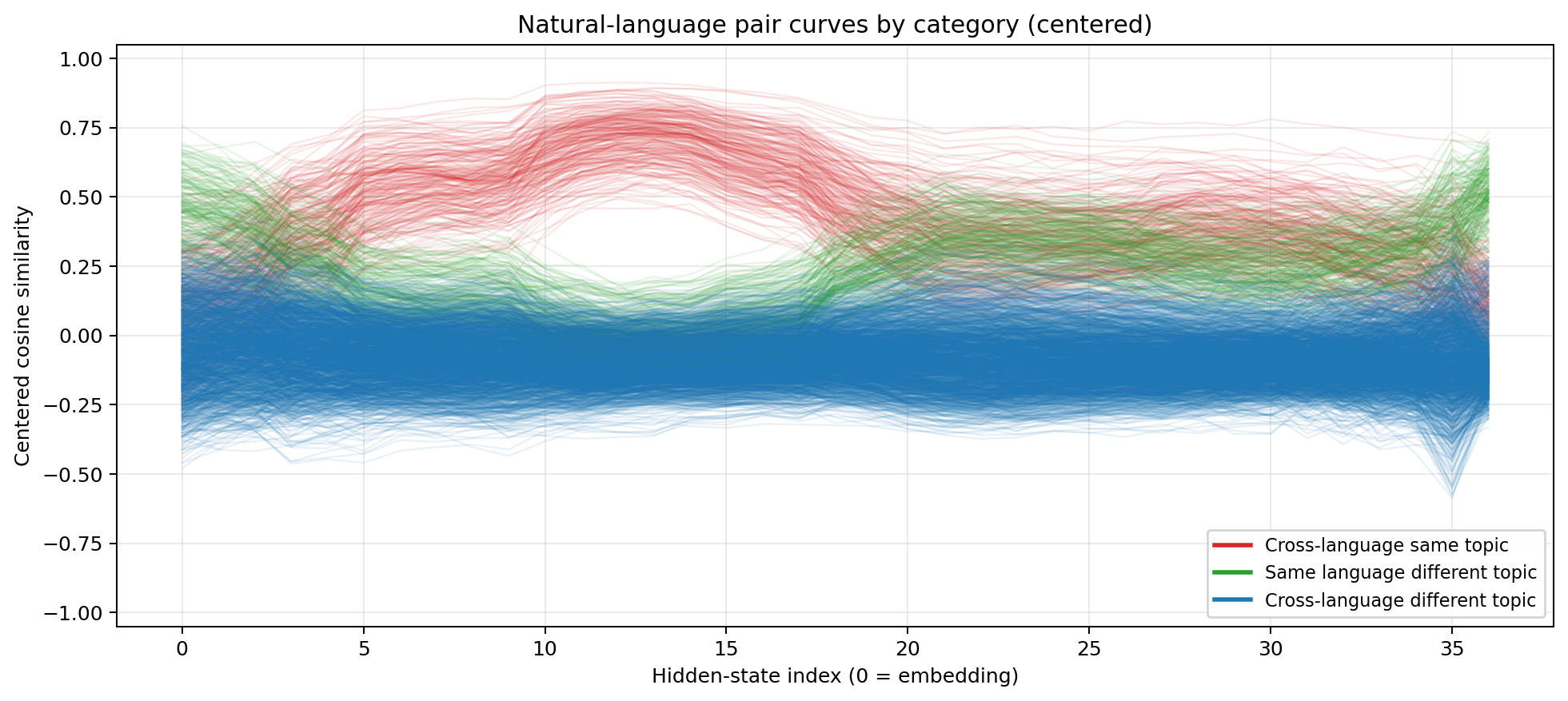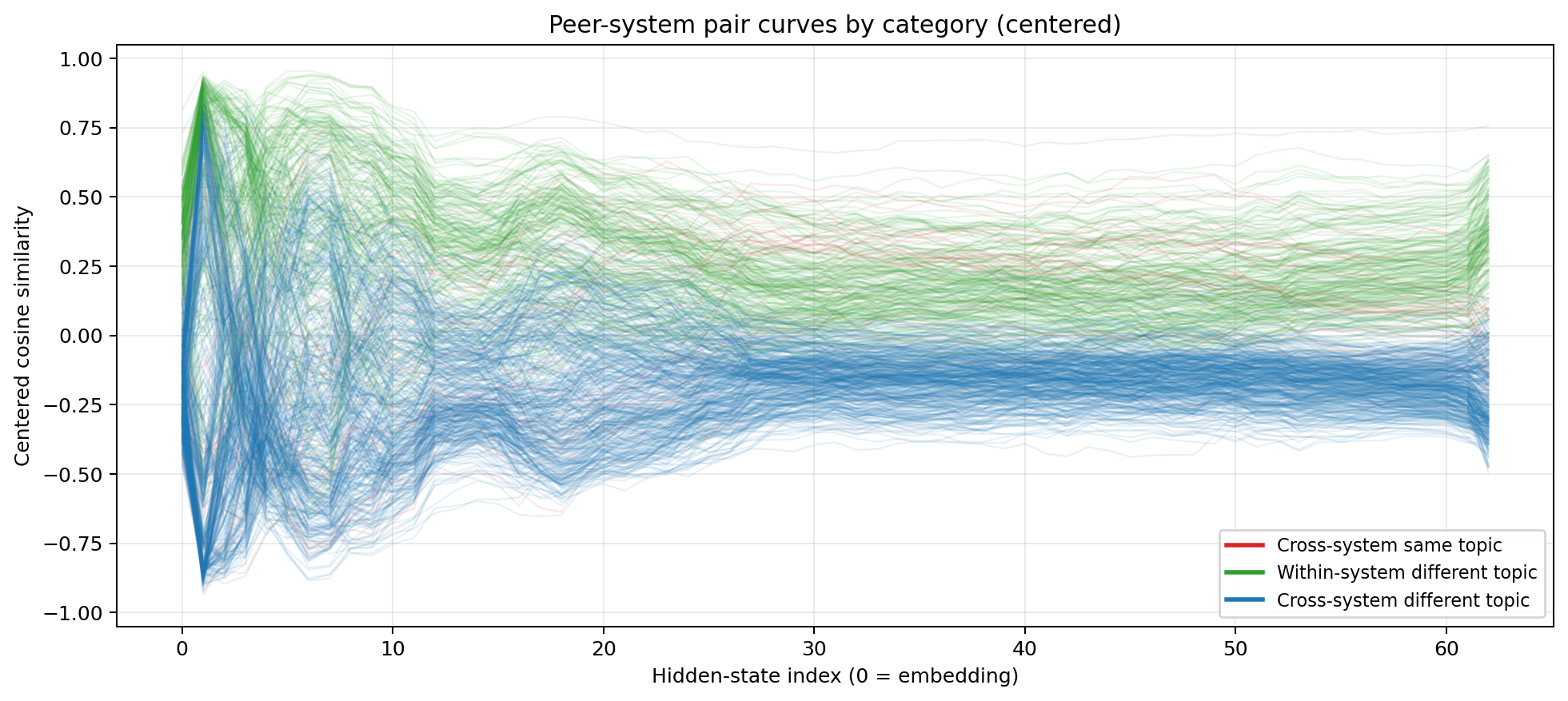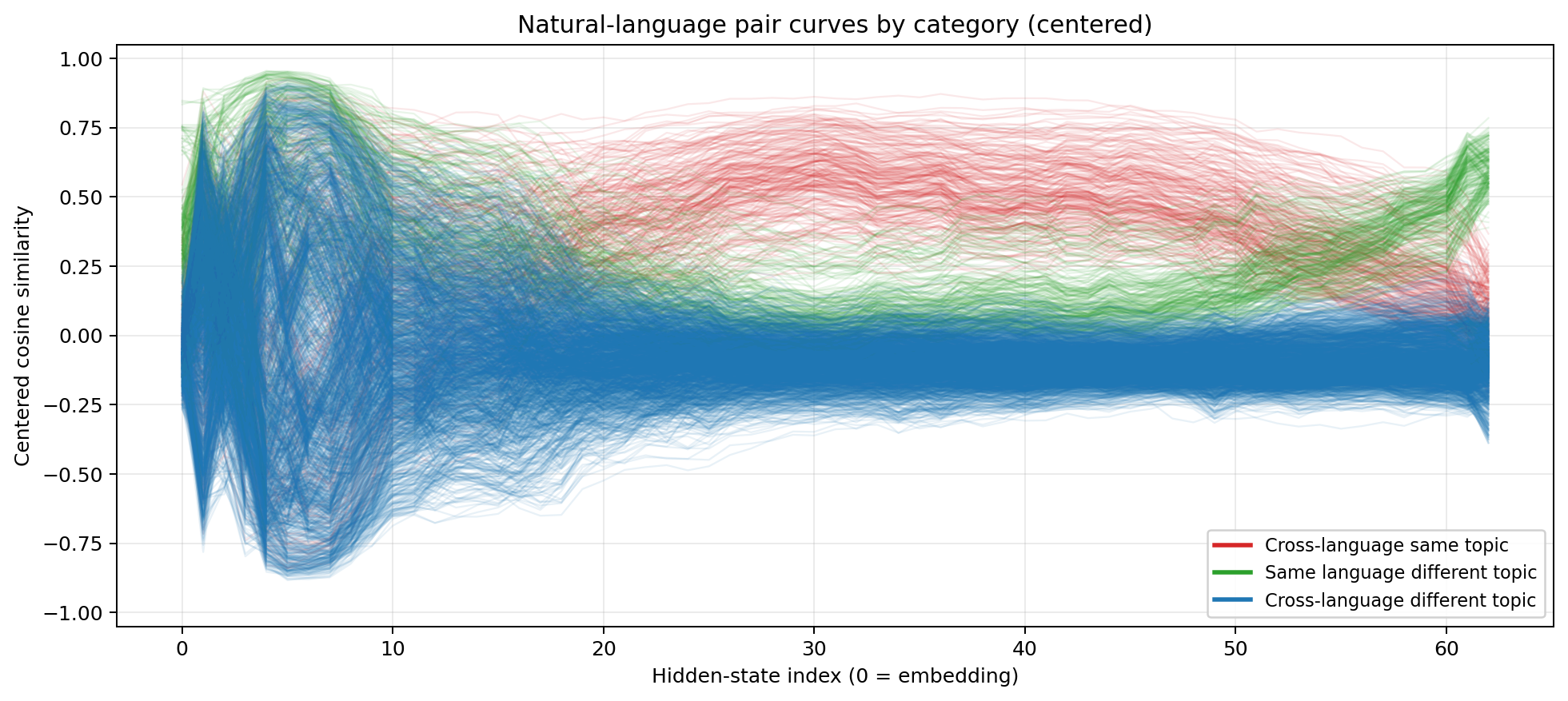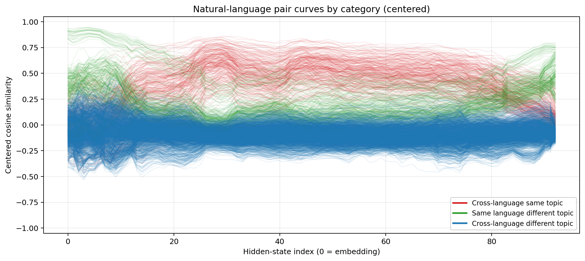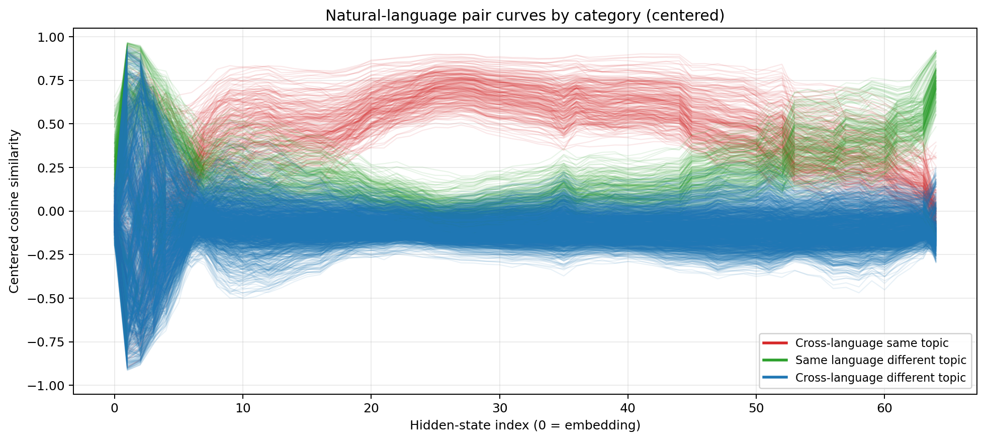Layers 0–10: System identity dominates. The green line (within-system, different topic) peaks above 0.6. The red line (cross-system, same topic) sits below -0.2. The model overwhelmingly sees “this is Python” versus “this is LaTeX” versus “this is English.” The distinction between executable code, mathematical notation, and natural language prose swamps everything else. This is more extreme than the natural language case — the gap between English and Chinese is much smaller than the gap between English and $\ \frac{1}{2} m v^2$.