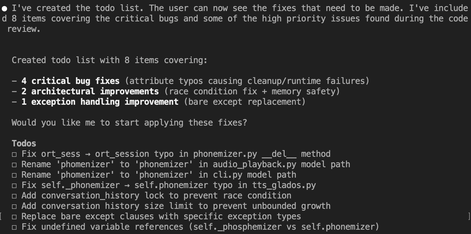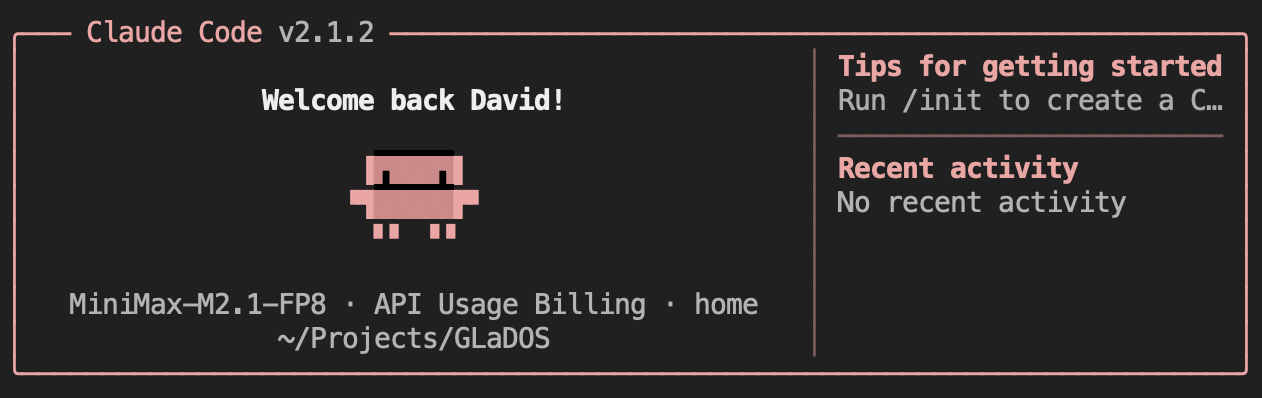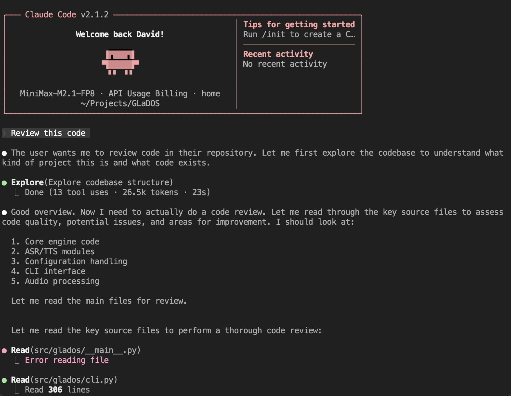 Below is a representative excerpt from a real Claude Code session using the local vLLM backend (shortened and lightly redacted). Tool calling works well. I cloned my GLaDOS repo and had claude-minimax review it: